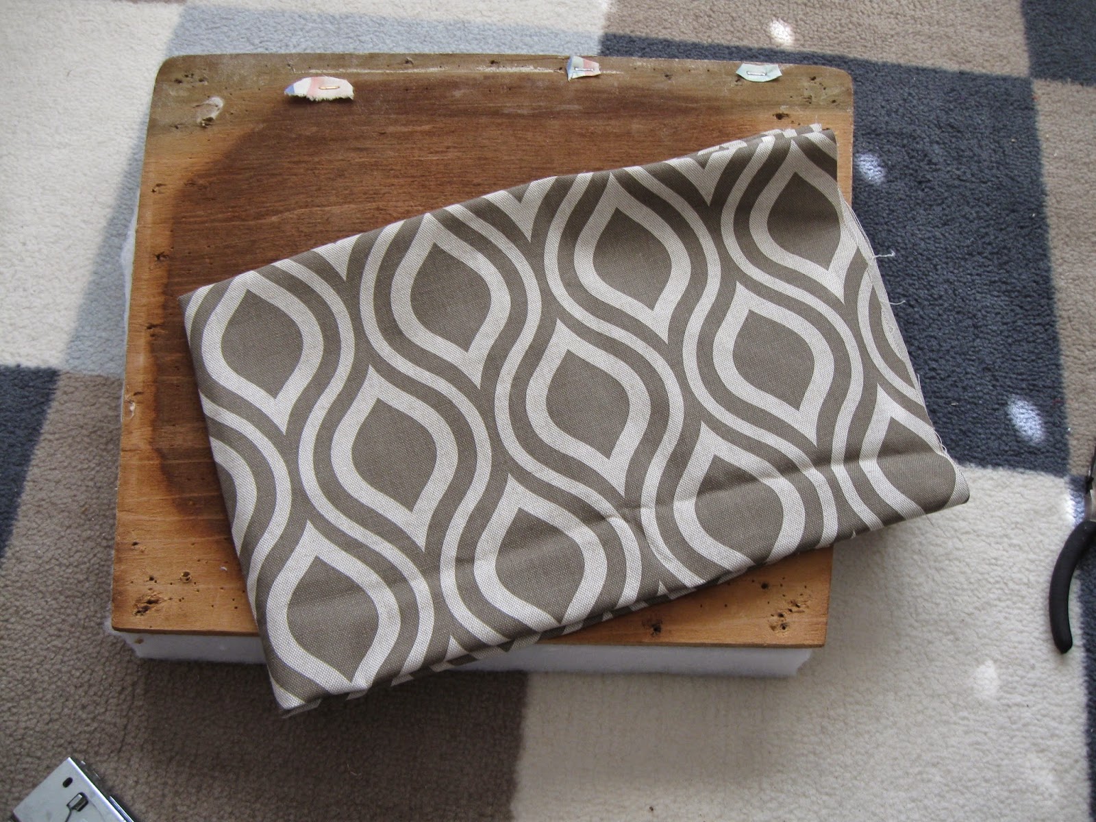 Iron your fabric, trim your new foam pad if necessary, and make a stack. Turn your fabric wrong-side up, place the foam pad in the middle of it, then place the seat board on top of it. Make sure everything is centered and squarely layered.